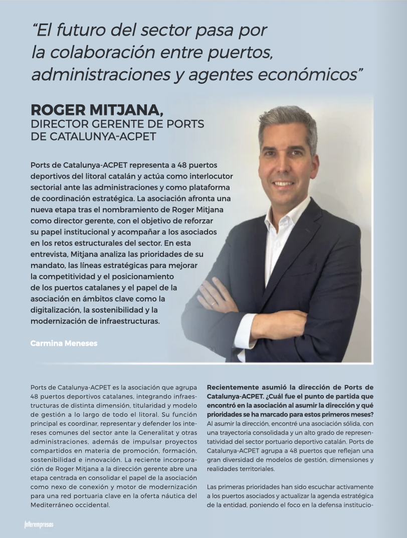 El director gerente de Ports de Catalunya-ACPET, Roger Mitjana, entrevistado en Interempresas donde analiza los retos y oportunidades actuales del sector de los puertos deportivos en Catalunya.